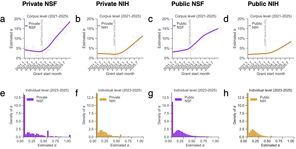 Across both agencies, proposals with stronger AI signals also tended to be less distinctive from recently funded work. Crucially, the study found this reflects genuine shifts in what researchers are proposing, not merely how they are writing — when the researchers held scientific content constant and appliedAI rewriting to existing abstracts, the semantic position of those proposals barely changed. The convergence is happening at the level of ideas.